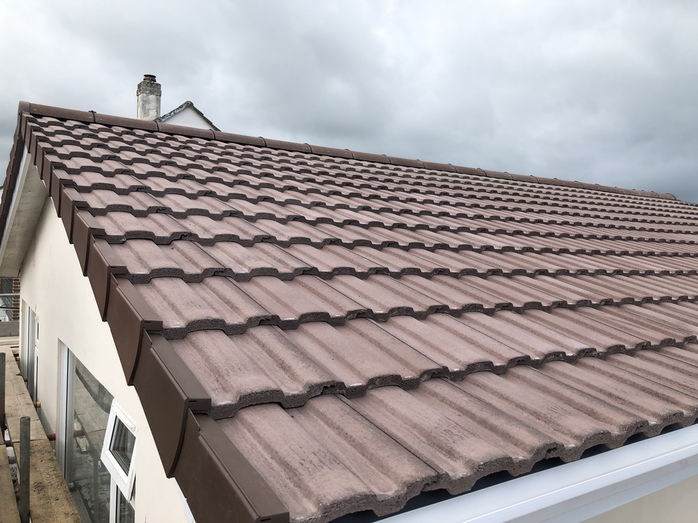 Roof was completely stripped of the old tiles, felt and batten then recovered with breathable membrane and 50mm x 25mm batten. New brown smooth face Redland Renowns were put on and individual dry verge fitted. A dry ridge system was used to finish off the roof.